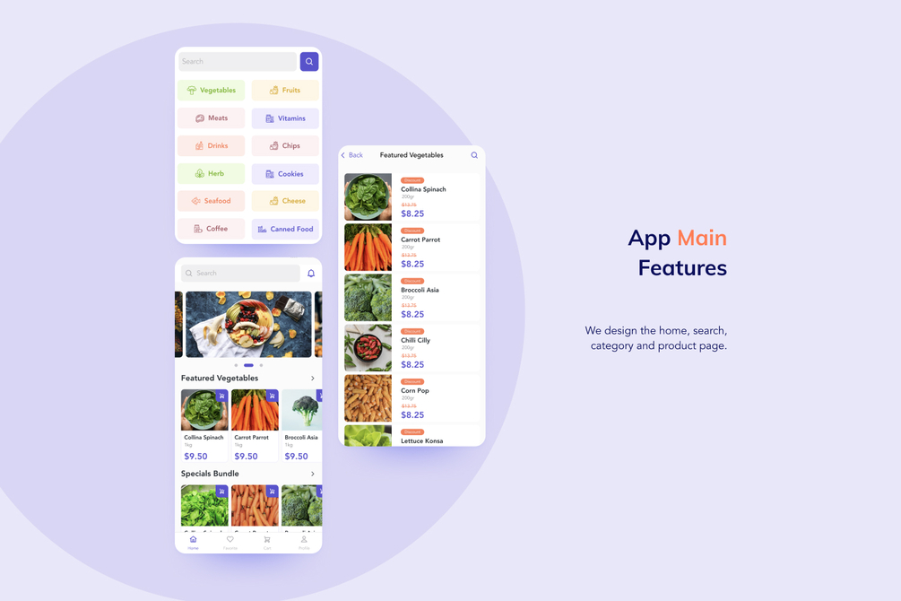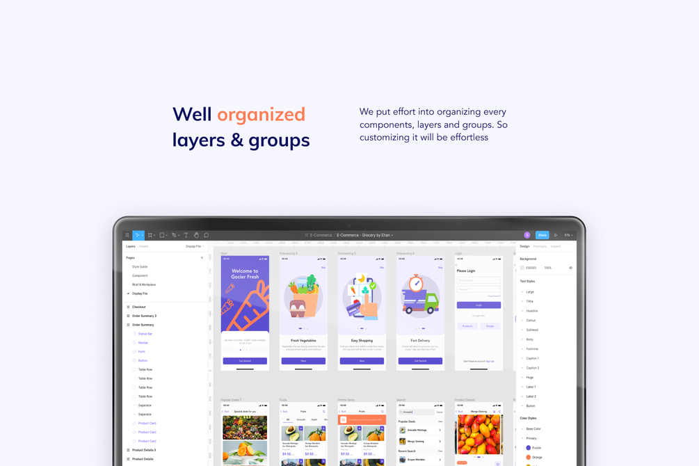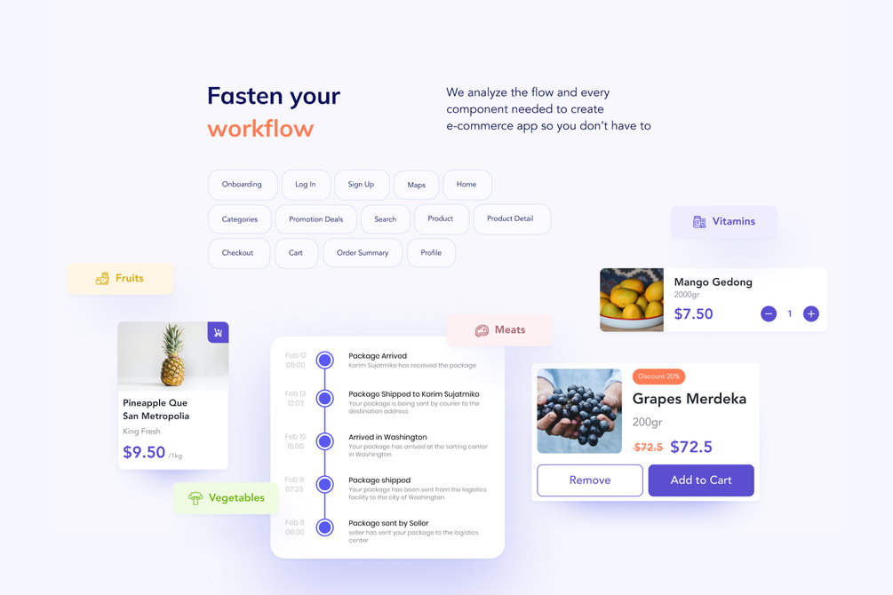 Gocier - Grocery E-commerce UI Kit is modernly crafted Figma wireframe template which can be used to kickstart your iOS Grocery app project. Fasten your workflow when creating app designs with this UI Kit, no need to start from scratch! This template consists of and **30 design screens** to make your workflow fast and seamless.