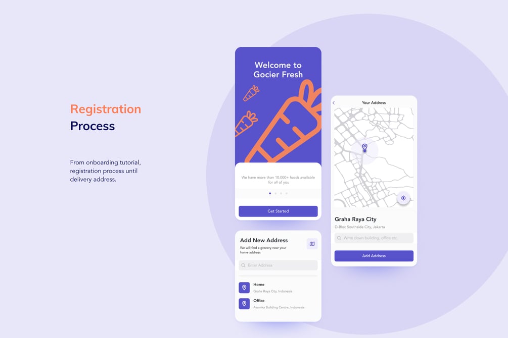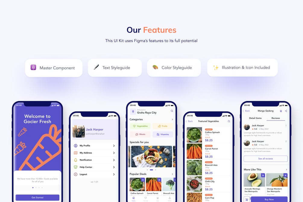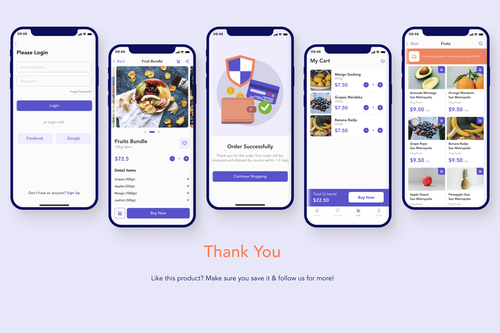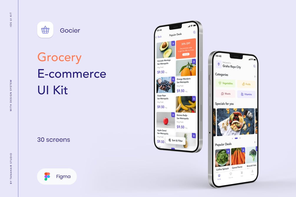 Gocier - Grocery E-commerce UI Kit is modernly crafted Figma wireframe template which can be used to kickstart your iOS Grocery app project. Fasten your workflow when creating app designs with this UI Kit, no need to start from scratch! This template consists of and **30 design screens** to make your workflow fast and seamless.